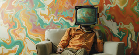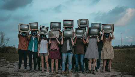 Group of individuals with retro TV heads symbolizes mass media influence and disinformation