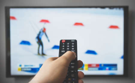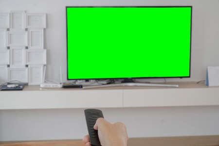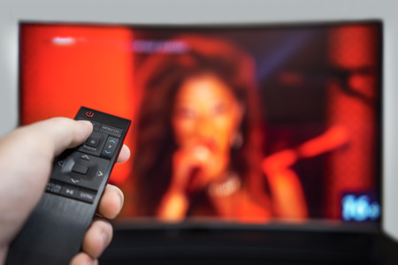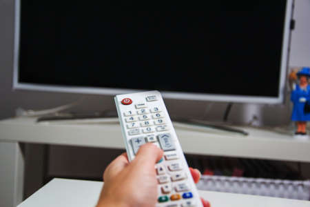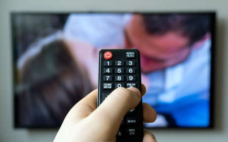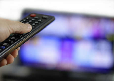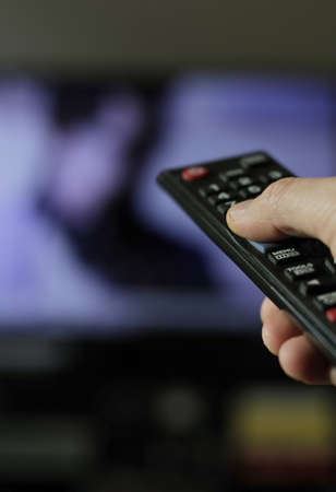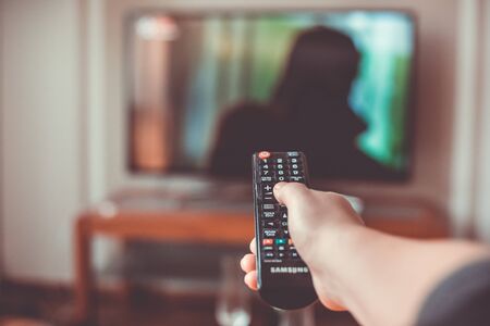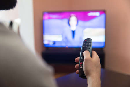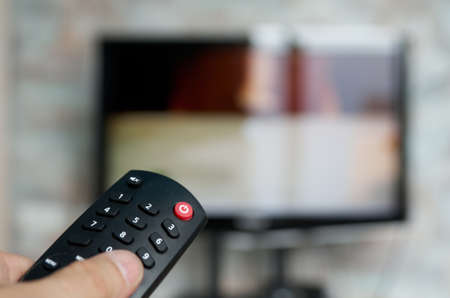Changing TV program: close up of human hand holding television remote control on blurred background with TV screen