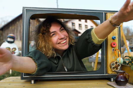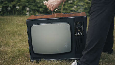 Old vintage retro TV stands on grass. Smoke rises from the damaged device. Man runs up to the TV, turns it off and pulls plug out of electrical outlet. Concept of fire hazard of old worn out equipment