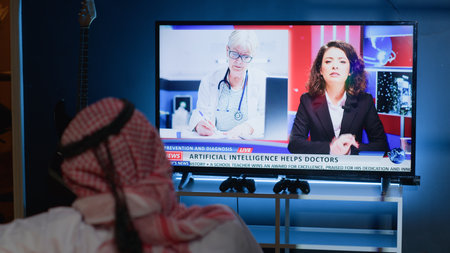 Arab man watching news broadcast about AI industry while relaxing at home after hard day at work. Muslim person chilling on couch, looking at TV channel showing Artificial Intelligence story