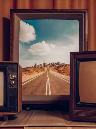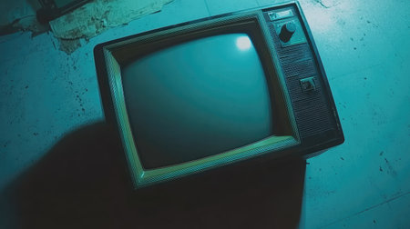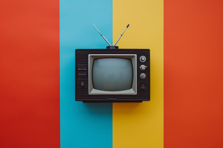 Old retro TV on a blue background with copy space, top view. Vintage television set in a flat lay composition for banner design. Retro style concept. Flat lay. Black TV on a blue background with copy space, top view. Vintage --chaos 30 --ar 16:9 --v 6.1 Job ID: a3206479-0e3f-4eb3-9ab0-b64d919df666