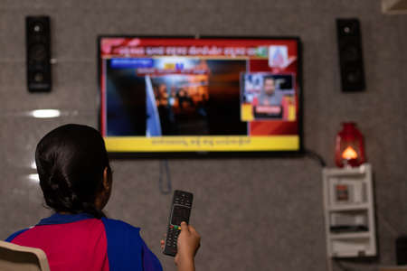 Maski, India, April 20, 2020 - Young girl watching coronavirus or covid-19 news on tv by holding remote in hand - Quarantine due to coronavirus - stay home concept