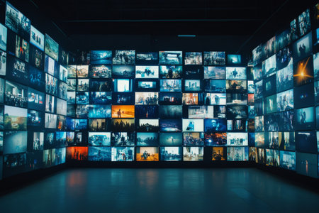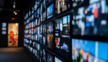 Diverse media displays on a wall with blurred dark background and professional camera focus