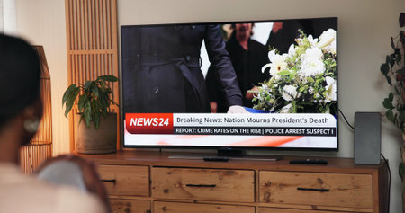 Television screen, watching and woman in home with breaking news on funeral broadcast. Update, media report and female person in living room with tv for streaming of political mourning event.