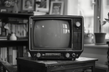Black and white photo of an old-fashioned television set in a nostalgic room with bookshelves and vintage decor.