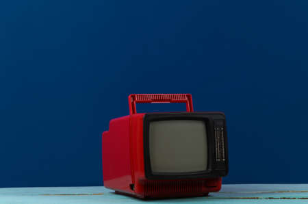 An old retro TV set on a blue background with copy space, viewed from above. A retro TV set in black color on a flat blue wall. The concept of an old-fashioned television for news and media content. Space for text on the right side. --chaos 30 --ar 16:9 --v 6.1 Job ID: f87f76a0-9e01-4afe-9703-9cd7858d21d7