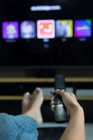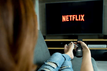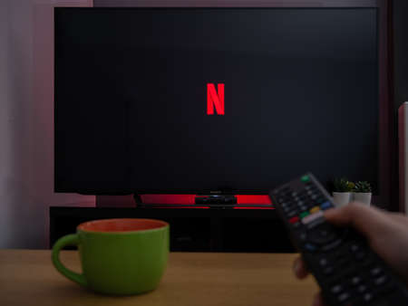 BANGKOK, THAILAND - August 3rd 2020 : Woman hand holding remote control and open Netflix application on TV screen. Netflix is one of the most popular paid entertainment and movie apps in Thailand.