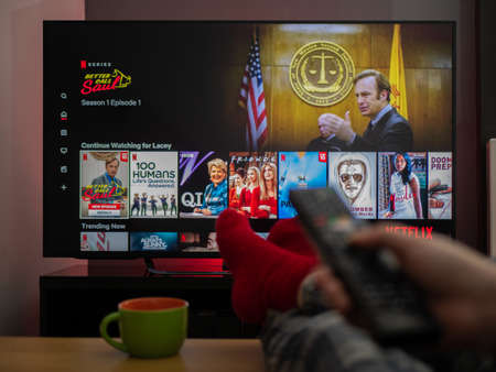 UK, March 2020: TV Television feet up with Netflix menu in background
