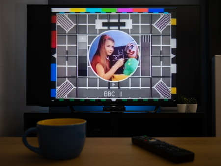 UK, March 2020: TV Television test card BBC girl with chalk board