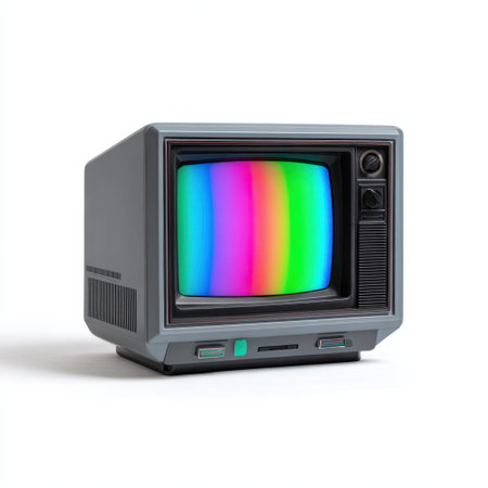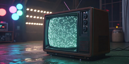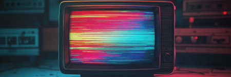 A vintage television set sits against a vibrant colorful background. The screen displays a playful static pattern that captures the retro aesthetic. This scene evokes nostalgia for classic media.