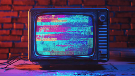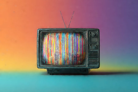 Vintage television set displaying colorful static signals against a vibrant gradient background, capturing retro aesthetics and nostalgia for classic media experiences