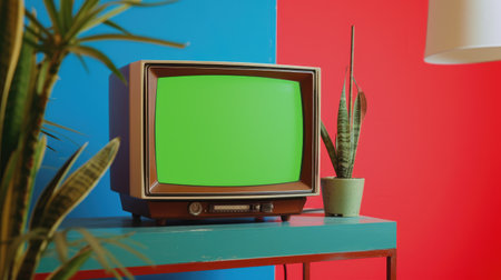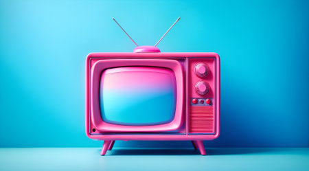 A retro television sits atop a wooden table, positioned before a striking two-toned backdrop. The television features a pastel blue and pink color scheme, with yellow accents. The composition highlights the technology against a color block background, suitable for various commercial or editorial uses.