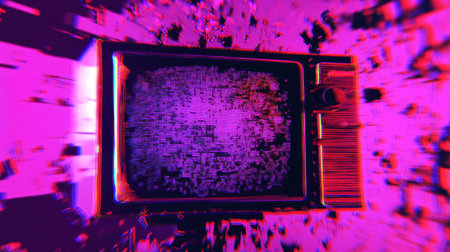 A retro television screen shows a burst of static noise and vibrant glitch patterns, creating a nostalgic atmosphere in the dimly lit space.