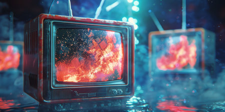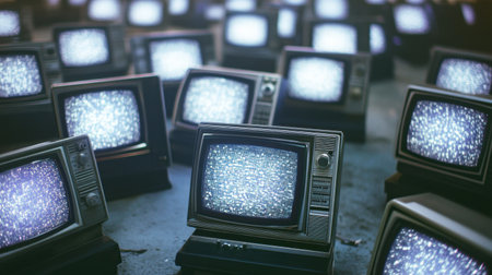 A visually striking collection of retro televisions displaying static noise in a darkened environment. The scene evokes nostalgia and technological themes.