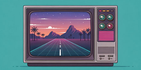 This artistic depiction features a vintage analog television and a retro lamp placed side by side on a bold, colorful background. The composition exudes nostalgic charm, celebrating timeless