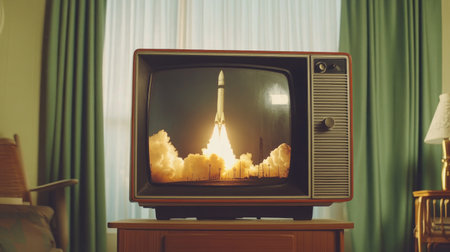A vintage television set displays the launch of an old rocket, placed in front of a dimly lit room with curtains drawn to hues of dark green and gray. The atmosphere is eerie yet captivating, evoking a sense of nostalgia for space exploration's past while hinting at its future. --chaos 30 --ar 16:9 --v 6.1 Job ID: b9ecefe0-53d3-4a62-a352-c304273da1da