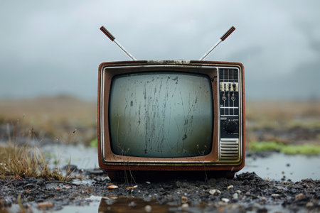 Vintage television set in field with puddle. Concept of propaganda and fake news