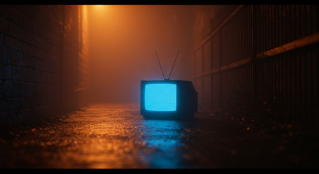An old CRT television sits in a dark, wet alley, its blue screen glowing with static. Moody lighting and atmospheric fog create a mysterious, retro-futuristic scene, perfect for themes of cyberpunk,