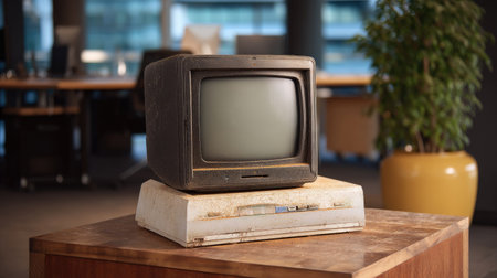 An artistic display of a vintage television set resting on an old table, set in a modern office environment. This juxtaposition highlights the contrast of eras in technology.