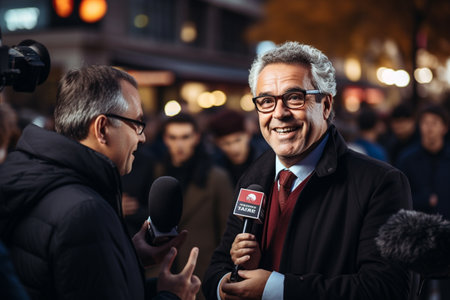 Male reporter with glasses is conducting an interview on a bustling street, surrounded by pedestrians and vehicles, showcasing the vibrant atmosphere of urban journalism
