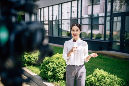 selective focus of attractive journalist holding microphone and speaking outside