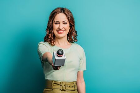 positive journalist smiling at camera while holding microphone on blue background