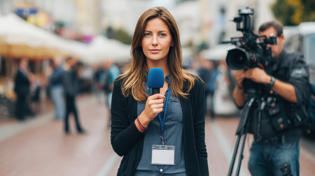 A female reporter stands in the middle of a busy street with a microphone in her hand, ready to cover an event live. Reporters at work.