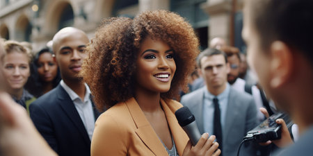 A confident, young woman with curly hair and bright blue eyes is being interviewed by the media outdoors. The image emphasizes public speaking, journalism, news reporting, and communication in an urban environment.