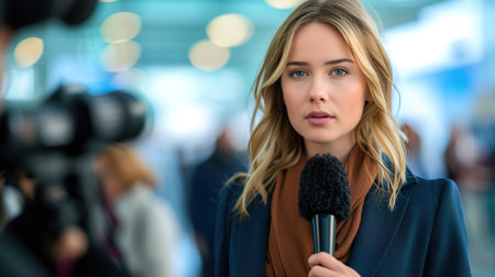 Confident female journalist reporting live, highlighting the fast-paced world of journalism.
