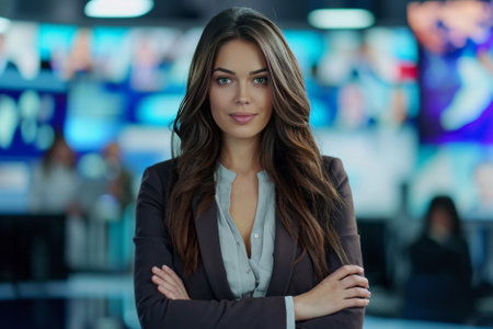 A female TV news anchor in a studio. AI generative
