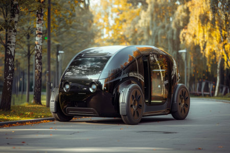 Futuristic autonomous concept car parked on wet pavement at dusk.