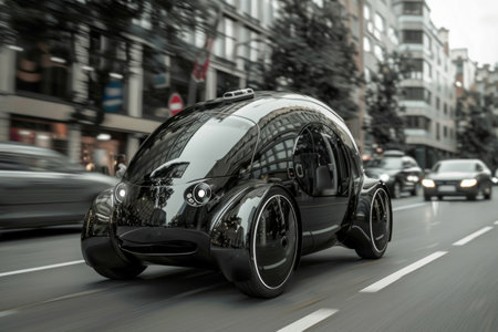 Electric Vehicle City Driving Future: Modern Car Speeds Through Urban Metropolis