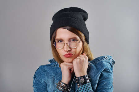 young pretty glasses fair-haired teenage hipster girl emotional posing , lifestyle people concept