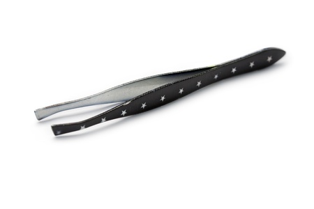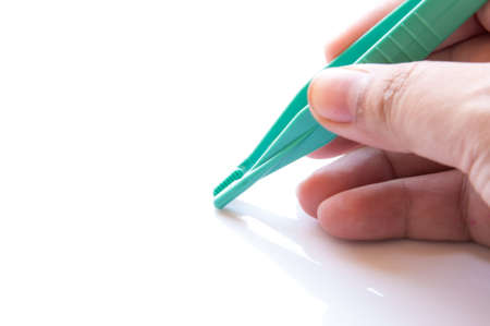 Close up picture of a person holding a tweezers in his hand in front of a white background