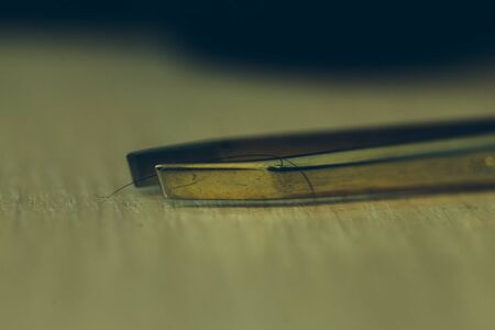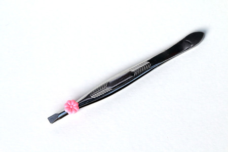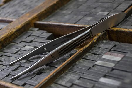 Professional cosmetics tweezers made of steel. Tweezers silvery color on table