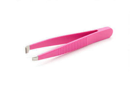 A close-up studio shot of a pair of bright pink tweezers. The tweezers have a textured grip and silver, pointed tips for precise hair removal.