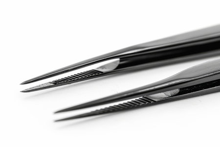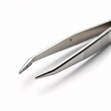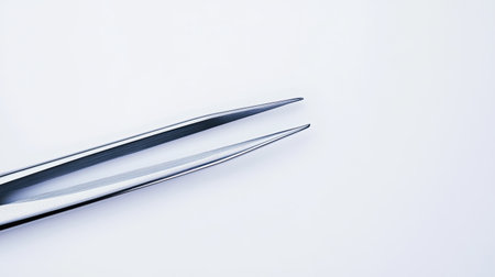 A close-up image showcasing precision stainless steel tweezers with pointed tips. The minimalist design features a shiny metallic finish against a clean white background, highlighting the tool's intricate details and quality.