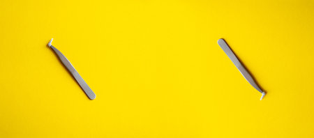 Close-up of makeup artist's tools for eyelash extension tweezers, brush for combing yellow color lie on light background. Space for text. Concept of beauty. Beauty salon. Long-term makeup. MOCKUP.