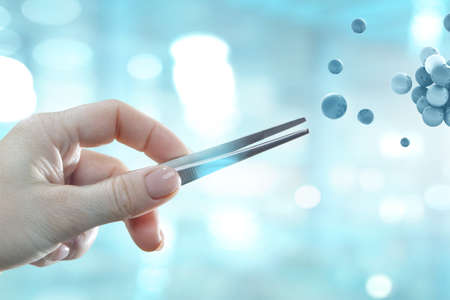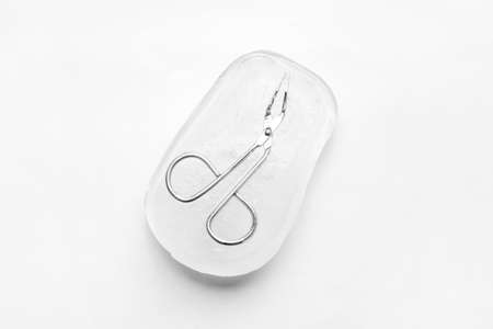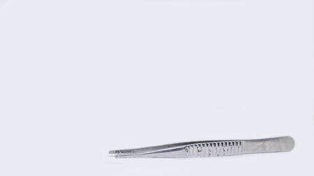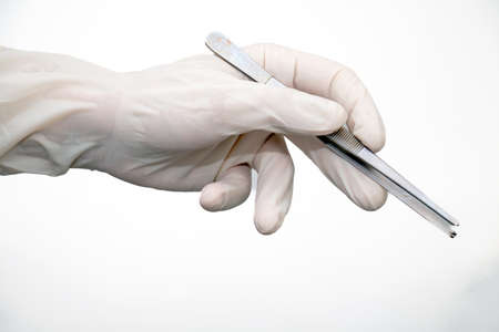Forceps in doctor hand with disposable glove on white background. Physician holds metallic, silver, steel surgical pincer. Medical equipment of stainless tool for surgery.