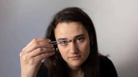 Young woman holding a precious stone with jewelry tweezers. Portrait of a gemologist.