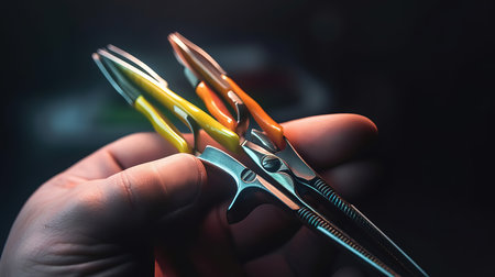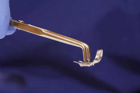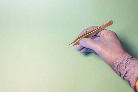 Close-up view of a dentist's hand in a latex glove with dental tongs and clasp. Shallow depth of field. Medical tools concept.