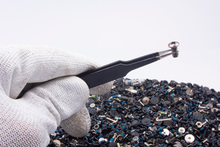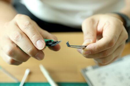 A precise operation of picking tiny surface-mount electronics components with tweezers on a white background illustrating meticulous work.