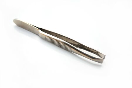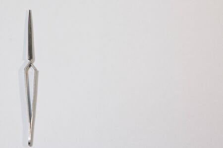 One pair of laboratory forceps placed diagonally across a clean white surface with copy space