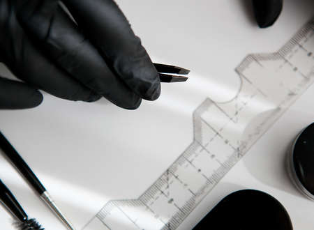 the master in black vinyl gloves holds a pair of tweezers for making eyebrows on the background of a ruler, brushes.