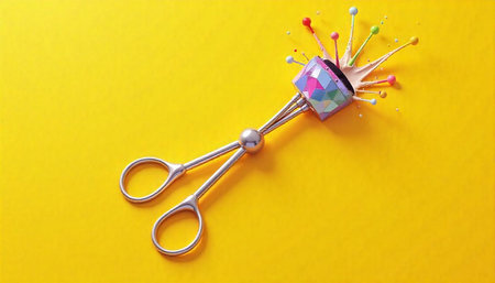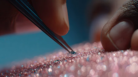 A skilled hand delicately uses tweezers to place a shimmering gemstone onto a glittering fabric surface, showcasing a vibrant and textured aesthetic.