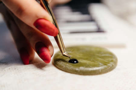 The gemologist use tweezer and preparing the specific of the precious stone.