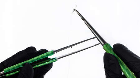 two tools with a needle for embroidery in black gloves on a white background