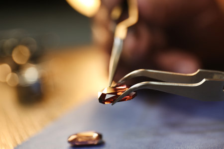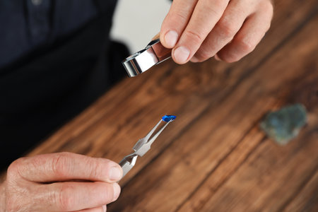 The gemologist use tweezer and preparing the specific of the precious stone.