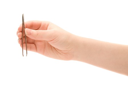 Hand holding tweezers on white background