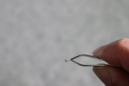 A single eyelash set with glue isolated in focus. Being held in hand with tweezers before being put on as a make up routine